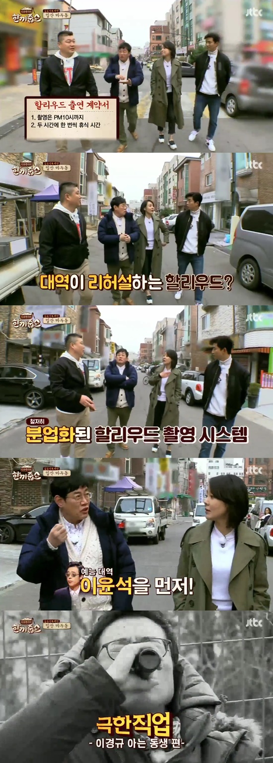 이경규는 "할리우드는 출연 계약서가 있다. 리허설도 본인이 안한다"고 했고, 이에 김윤진은 "카메라 세팅하고 포커스 맞추는 동선 체크는 대역이 한다"고 할리우드의 분업화 시스템을 언급했다.