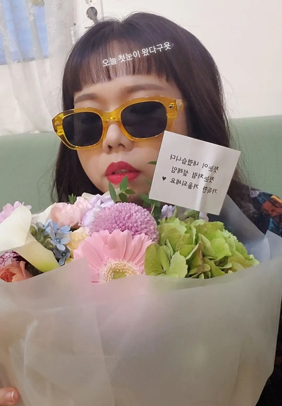 공개된 사진 속 홍현희는 커다란 꽃다발을 들고 있는 모습. 꽃다발 속 메모에는 '첫눈이 내렸습니다. 첫눈처럼 설레임 가득한 겨울 되세요'라는 글이 적혀있다.