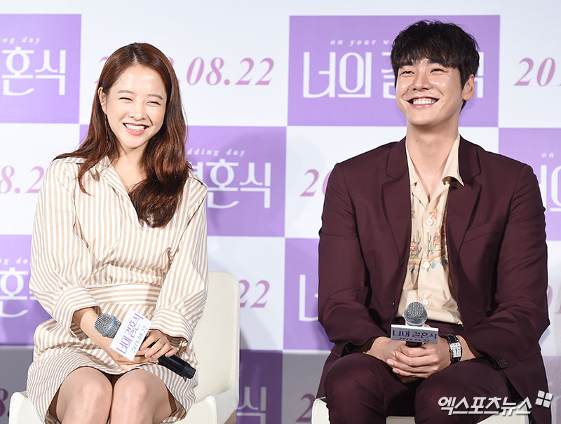 [엑스포츠뉴스 박지영 기자] 23일 오전 서울 중구 메가박스 동대문점에서 열린 영화 '너의 결혼식' 제작보고회에 참석한 배우 박보영, 김영광이 미소짓고 있다.