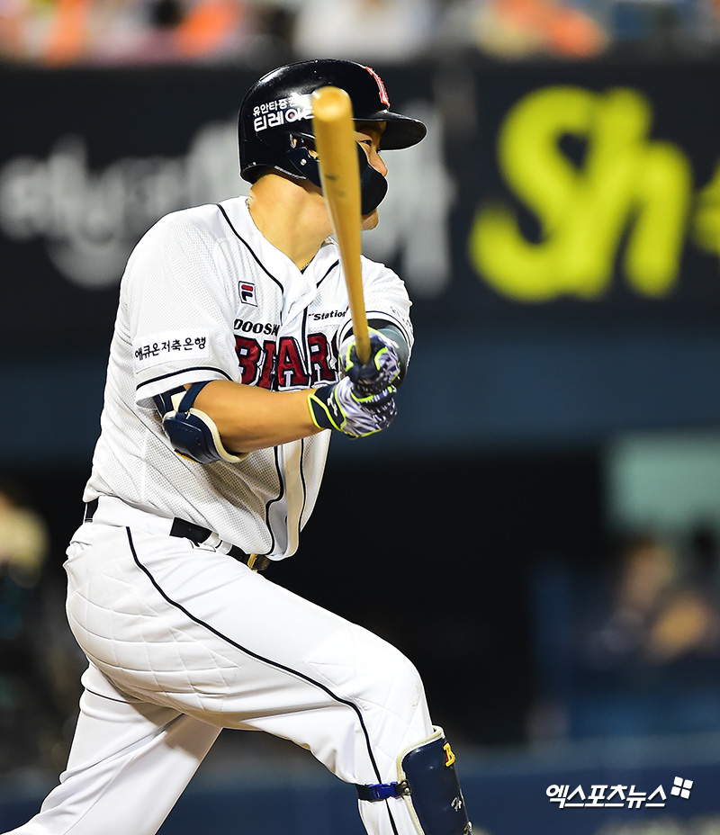 [엑스포츠뉴스 잠실, 김한준 기자] 28일 오후 서울 송파구 잠실야구장에서 열린 '2018 신한은행 MY CAR KBO리그' 한화 이글스와 두산 베어스의 경기, 8회말 2사 1,2루 두산 오재일이 1타점 적시타를 날리고 있다.