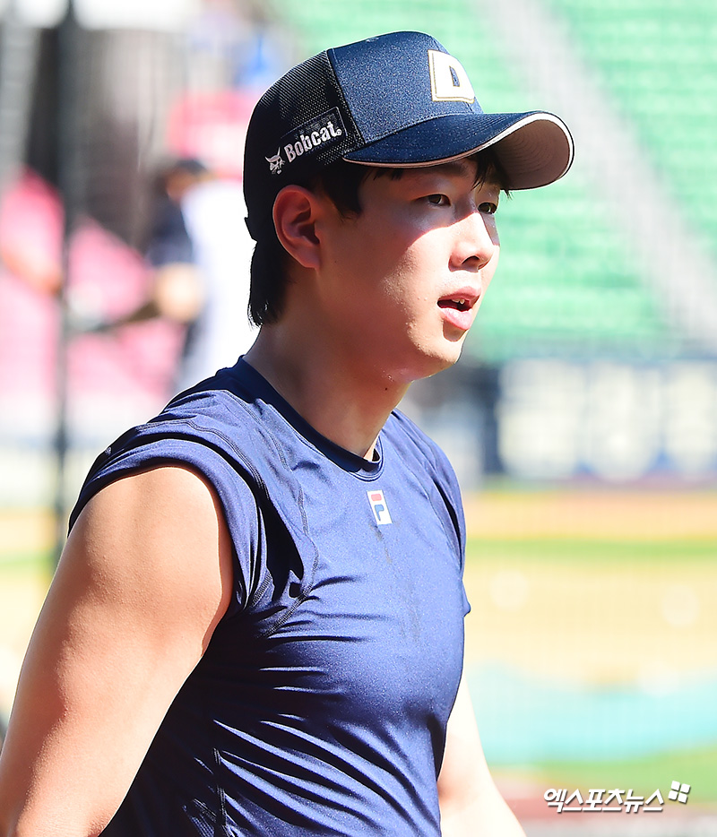 [엑스포츠뉴스 잠실, 김한준 기자] 29일 오후 서울 송파구 잠실야구장에서 열리는 '2018 신한은행 MY CAR KBO리그' 한화 이글스와 두산 베어스의 경기, 두산 박건우가 훈련에 임하고 있다.