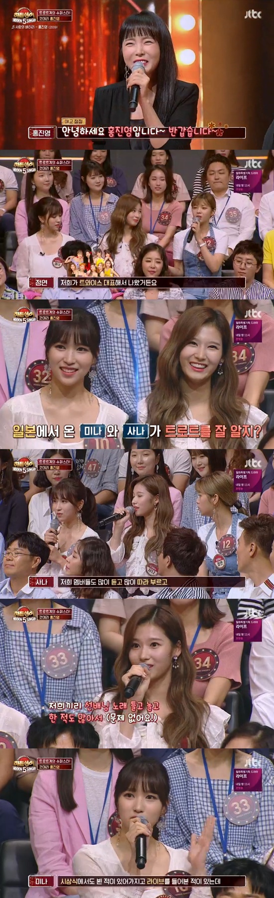 사나는 "트와이스 멤버들이 홍진영의 노래를 자주 듣는다. 들으면서 놀고 해서 잘 맞힐거 같다"라고 말했다.