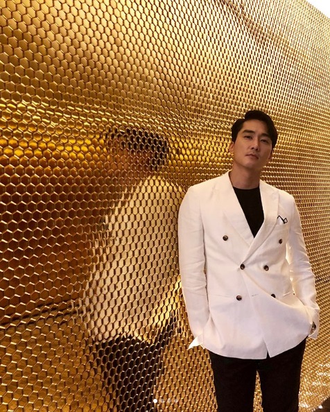 공개된 사진 속 송승헌은 흰색 재킷을 입고 다양한 포즈를 취하고 있다. 송승헌은 화려한 금색 벽 앞에서도 빛나는 미모를 자랑한다.