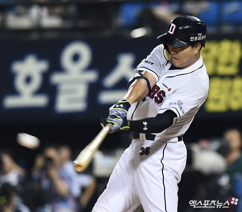 [엑스포츠뉴스 잠실, 박지영 기자] 1일 오후 서울 송파구 잠실야구장에서 열린 '2018 신한은행 MY CAR KBO리그' LG 트윈스와 두산 베어스의 경기, 6회말 1사 만루 두산 오재일이 중견수 1타점 희생플라이를 때려내고 있다.