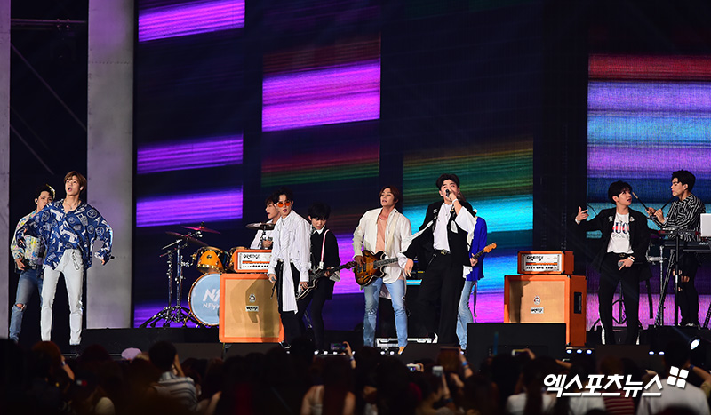 [엑스포츠뉴스 김한준 기자] 2일 오후 서울 구로구 고척스카이돔에서 열린 '2018 코리아 뮤직 페스티벌'에 참석한 엔플라잉, 더 이스트라이트가 멋진 공연을 선보이고 있다.