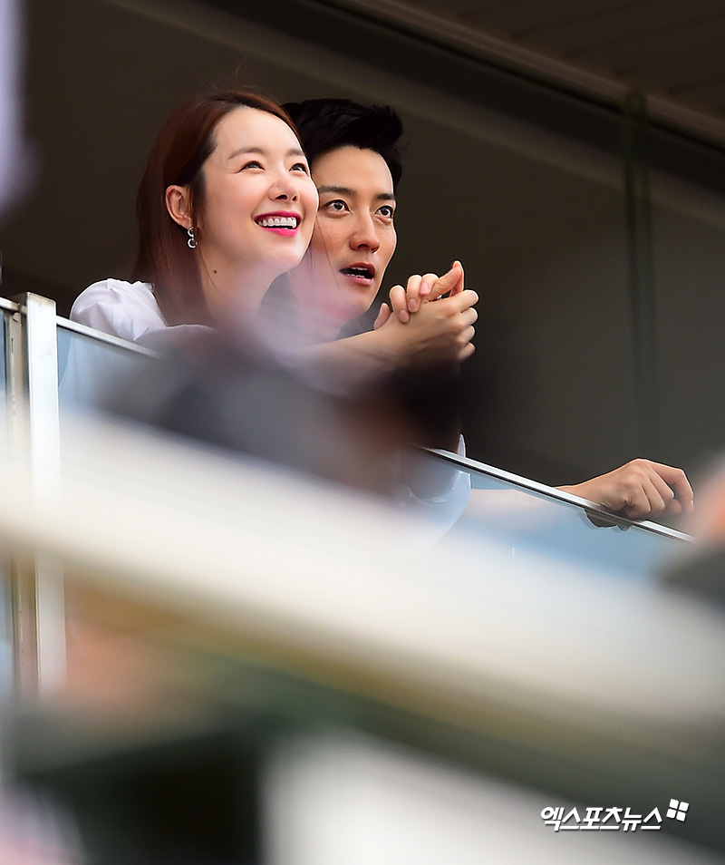 [엑스포츠뉴스 대전, 김한준 기자] 4일 오후 대전광역시 중구 한화생명이글스파크에서 열린 '2018 신한은행 MY CAR KBO리그' NC 다이노스와 한화 이글스의 경기, 배우 인교진 소이현 부부가 경기를 관람하고 있다.