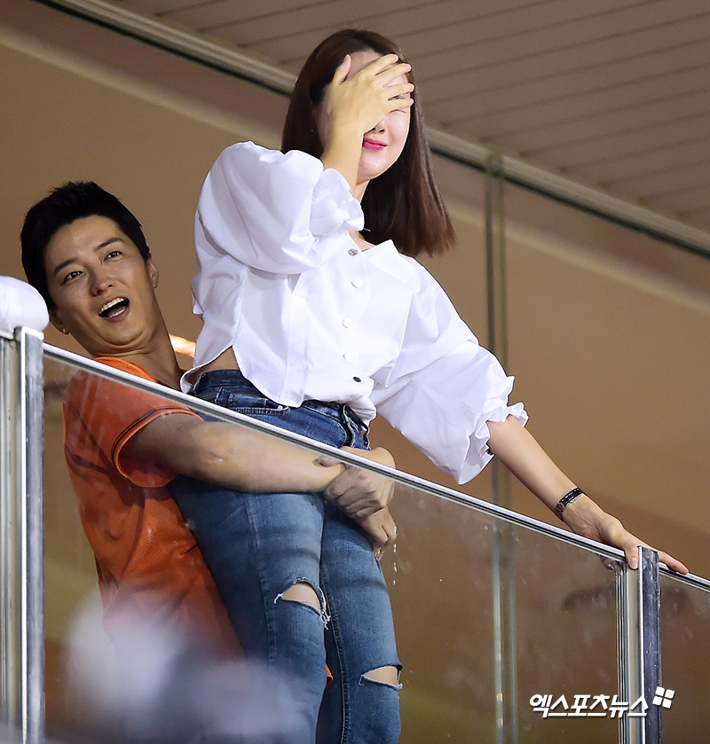 [엑스포츠뉴스 대전, 김한준 기자] 4일 오후 대전광역시 중구 한화생명이글스파크에서 열린 '2018 신한은행 MY CAR KBO리그' NC 다이노스와 한화 이글스의 경기, 배우 인교진 소이현 부부가 이벤트에 임하고 있다.
