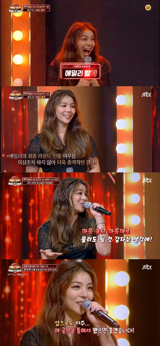 이날 에일리는 '히든싱어5'에서 3라운드 탈락자가 됐지만, 마지막 라운드에서 52표를 받으며 명예회복에 성공했다. 또 감동적인 이야기를 전하고 폭발적인 가창력을 선사해 눈길을 끌었다.
