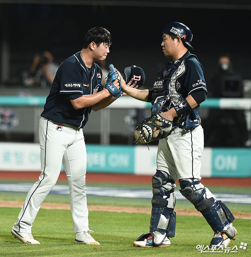 경기 종료 후 두산 함덕주-양의지 배터리가 승리의 기쁨을 나누고 있다.