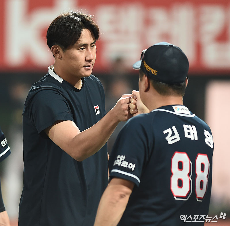 경기 종료 후 두산 이용찬이 김태형 감독과 주먹을 맞대고 있다.