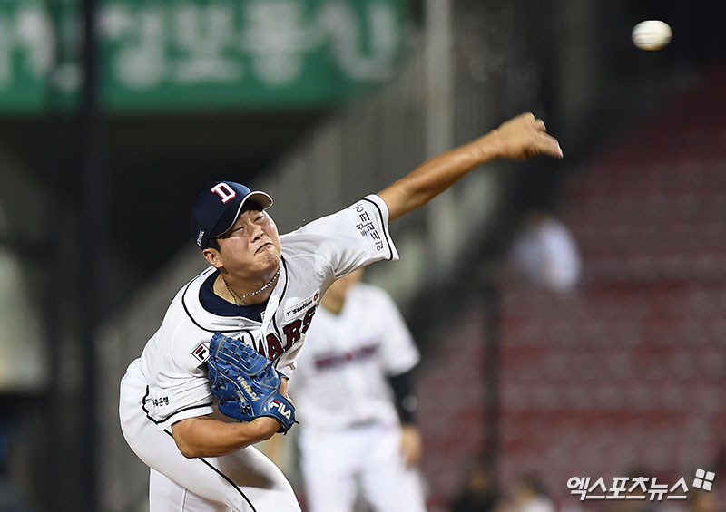 [엑스포츠뉴스 잠실, 박지영 기자] 14일 오후 서울 송파구 잠실야구장에서 열린 '2018 신한은행 MY CAR KBO리그' SK 와이번스와 두산 베어스의 경기, 9회초 무사 두산 함덕주가 역투하고 있다.