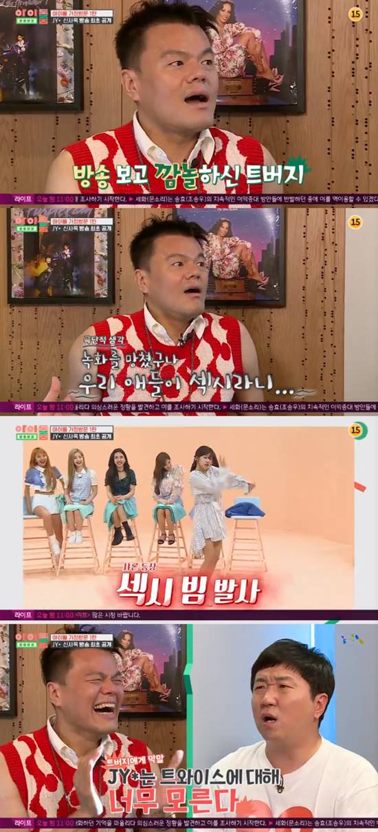 이날 박진영은 '아이돌룸'에 트와이스가 나온 것을 챙겨봤다고 말하면서 방송 후기를 들려줬다. 박진영은 예능감이 좋아진 트와이스에 만족감을 드러내며 "방송을 볼 때 트와이스에게 '섹시'를 요청하지 않았나. 트와이스는 섹시와는 어울리지 않아서 걱정했다"고 말했다.
