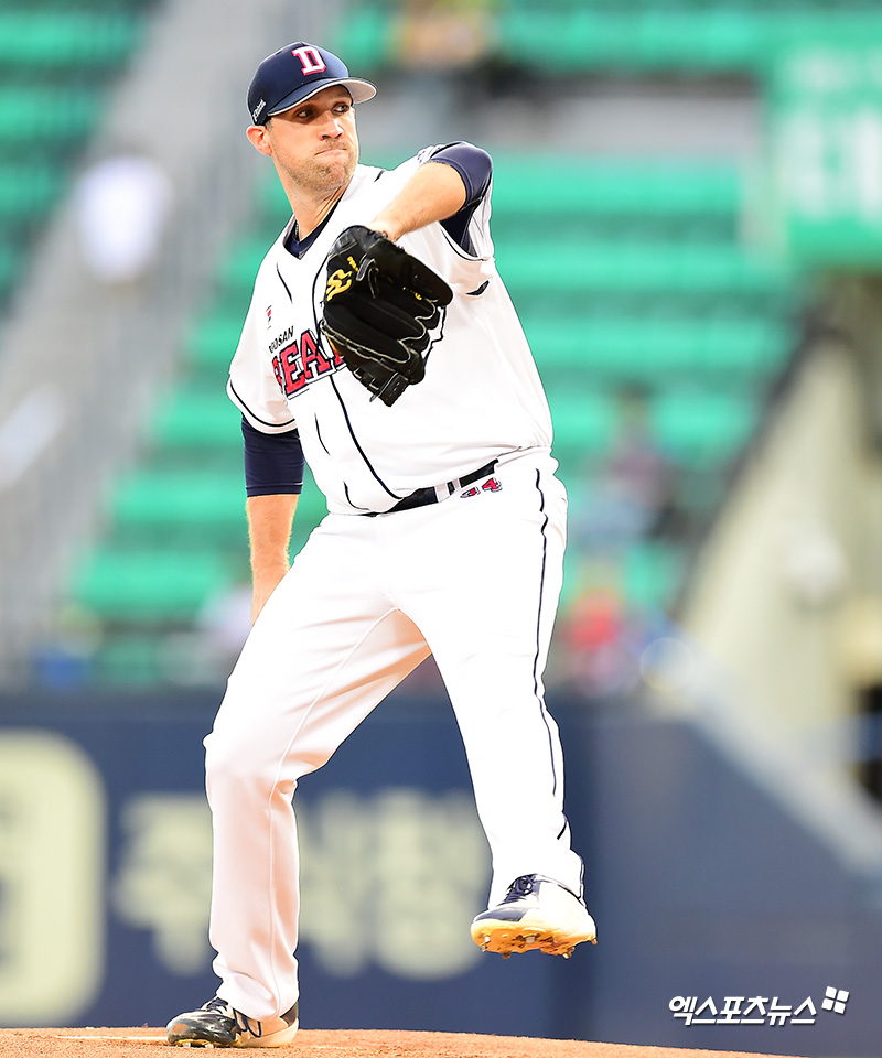 [엑스포츠뉴스 잠실, 김한준 기자] 4일 오후 서울 송파구 잠실야구장에서 열린 '2018 신한은행 MY CAR KBO리그' KIA 타이거즈와 두산 베어스의 경기, 1회초 두산 선발투수 린드블럼이 공을 힘차게 던지고 있다.