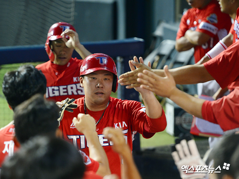 [엑스포츠뉴스 잠실, 김한준 기자] 4일 오후 서울 송파구 잠실야구장에서 열린 '2018 신한은행 MY CAR KBO리그' KIA 타이거즈와 두산 베어스의 경기, 8회초 1사 만루 KIA 안치홍이 최형우의 2타점 적시타때 득점에 성공한 후 더그아웃에서 하이파이브를 하고 있다.