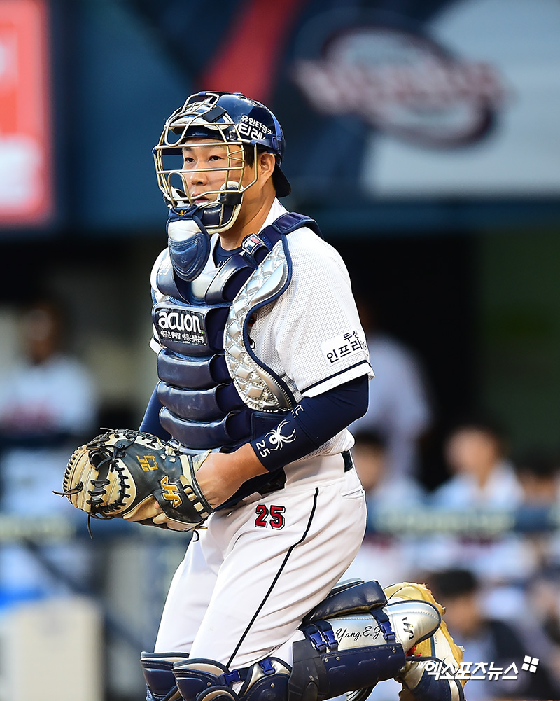 [엑스포츠뉴스 잠실, 김한준 기자] 5일 오후 서울 송파구 잠실야구장에서 열린 '2018 신한은행 MY CAR KBO리그' KIA 타이거즈와 두산 베어스의 경기, 1회초 두산 양의지가 경기에 임하고 있다.