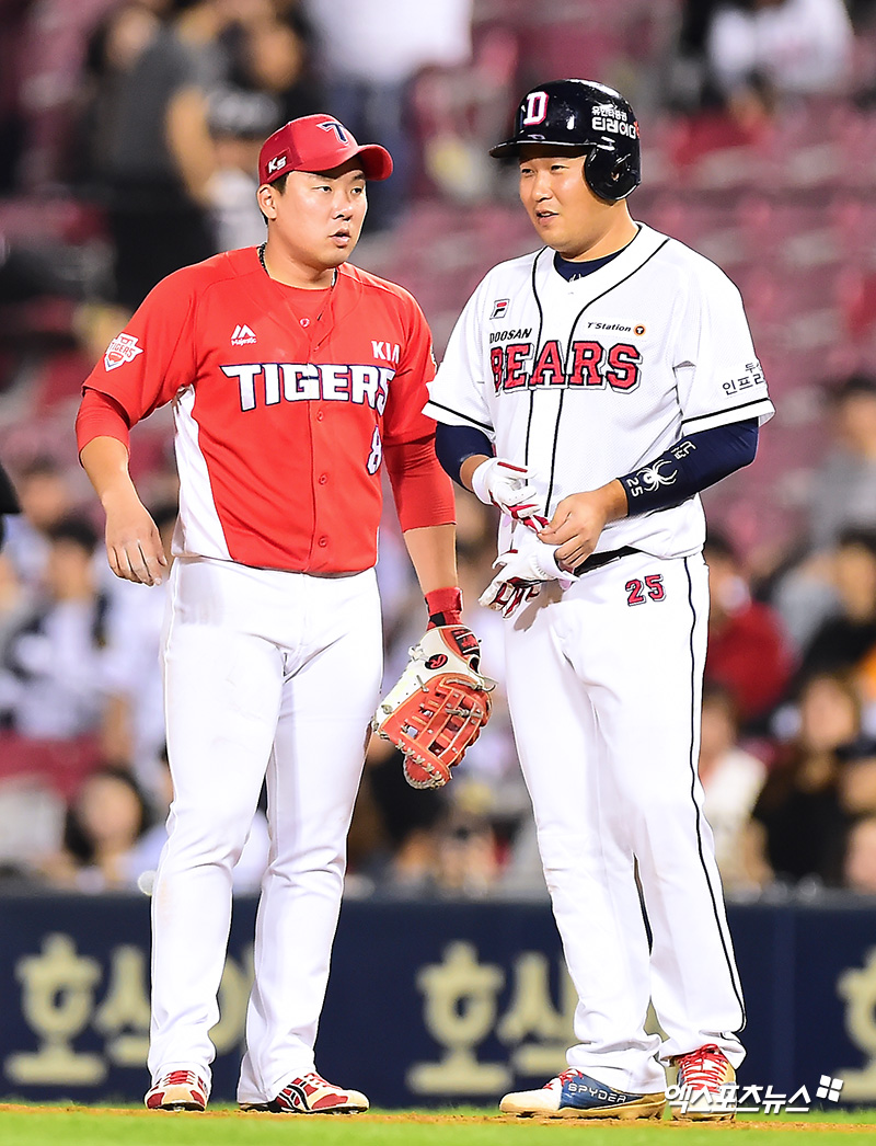 [엑스포츠뉴스 잠실, 김한준 기자] 5일 오후 서울 송파구 잠실야구장에서 열린 '2018 신한은행 MY CAR KBO리그' KIA 타이거즈와 두산 베어스의 경기, 7회말 무사 1루 두산 양의지가 사구로 인해 출루한 후 KIA 안치홍과 대화를 나누고 있다.