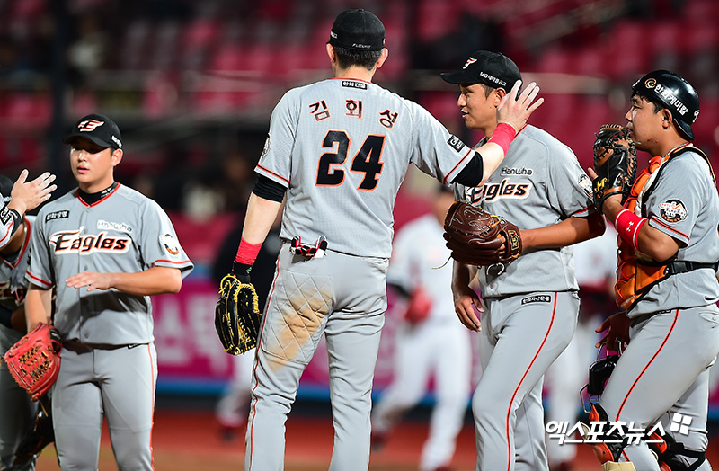 이날 경기에서 승리한 한화가 하이파이브를 하고 있다.
