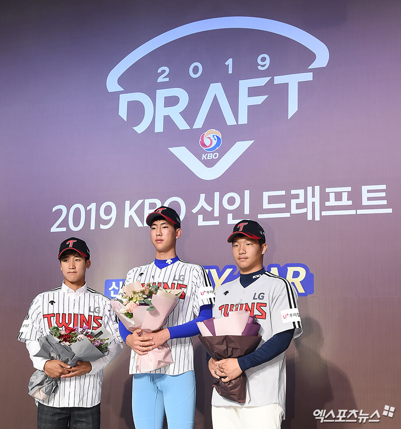 [엑스포츠뉴스 박지영 기자] 10일 오후 서울 소공동 웨스틴조선호텔 그랜드볼룸에서 열린 '2019 KBO 신인 2차 드래프트'에서 LG 트윈스에 지명된 선수들이 기념 촬영을 하고 있다.