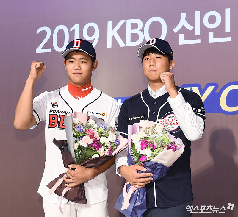 [엑스포츠뉴스 박지영 기자] 10일 오후 서울 소공동 웨스틴조선호텔 그랜드볼룸에서 열린 '2019 KBO 신인 2차 드래프트'에서 두산 베어스에 지명된 선수들이 기념 촬영을 하고 있다.
