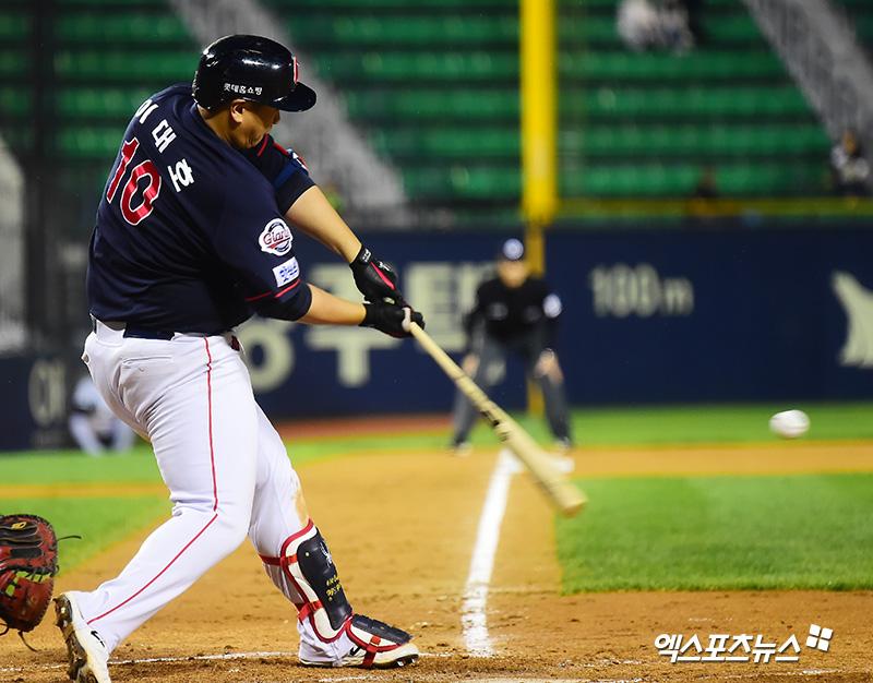 [엑스포츠뉴스 잠실, 김한준 기자] 19일 오후 서울 송파구 잠실야구장에서 열린 '2018 신한은행 MY CAR KBO리그' 롯데 자이언츠와 LG 트윈스의 경기, 5회초 1사 1루 롯데 이대호가 타격을 하고 있다.