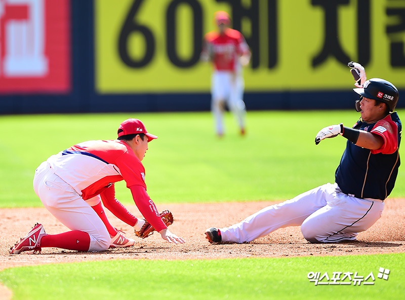 [엑스포츠뉴스 수원, 김한준 기자] 26일 오후 경기도 수원시 장안구 수원kt위즈파크에서 열린 '2018 신한은행 MY CAR KBO리그' KIA 타이거즈와 kt 위즈의 경기, 1회말 무사 1루 KT 강백호가 2루 도루를 시도하고 있다.
