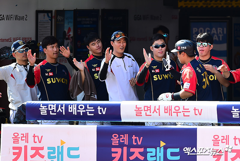 [엑스포츠뉴스 수원, 김한준 기자] 26일 오후 경기도 수원시 장안구 수원kt위즈파크에서 열린 '2018 신한은행 MY CAR KBO리그' KIA 타이거즈와 kt 위즈의 경기, 1회초 무사 2루 KT 강백호가 심우준의 1타점 2루타때 득점에 성공한 후 더그아웃에서 하이파이브를 하고 있다.