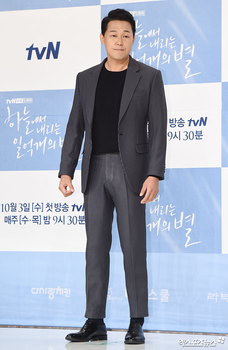 [엑스포츠뉴스 박지영 기자] 28일 오후 서울 영등포구 타임스퀘어에서 열린 tvN 새 수목드라마 '하늘에서 내리는 일억개의 별' 제작발표회에 참석한 배우 박성웅이 포즈를 취하고 있다.