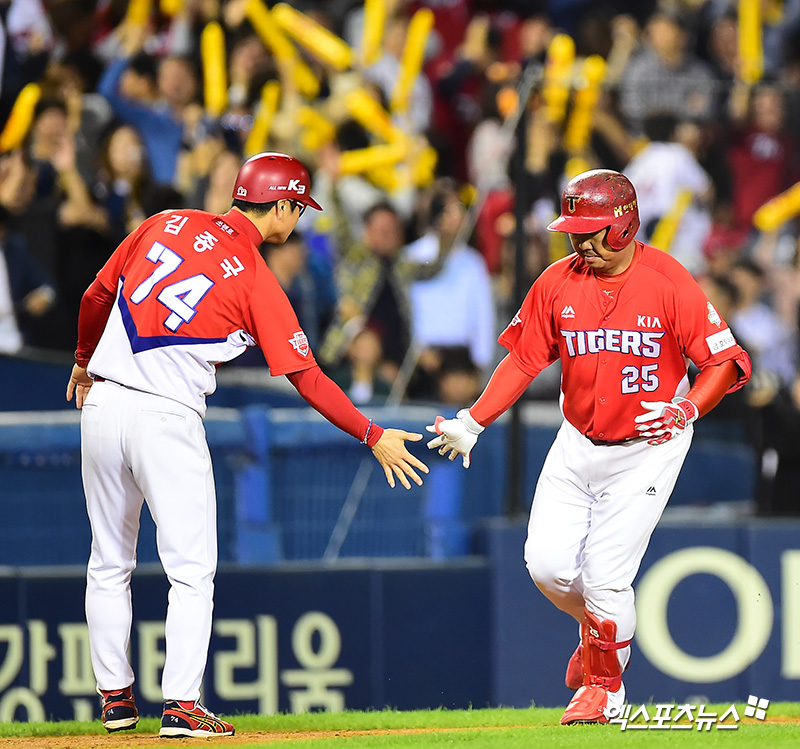 [엑스포츠뉴스 잠실, 김한준 기자] 28일 오후 서울 송파구 잠실야구장에서 열린 '2018 신한은행 MY CAR KBO리그' KIA 타이거즈와 LG 트윈스의 경기, 8회초 1사 만루 KIA 이범호가 만루 홈런을 날린 후 김종국 코치와 하이파이브를 하고 있다.
