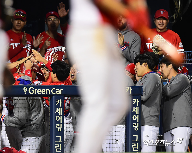 [엑스포츠뉴스 잠실, 김한준 기자] 28일 오후 서울 송파구 잠실야구장에서 열린 '2018 신한은행 MY CAR KBO리그' KIA 타이거즈와 LG 트윈스의 경기, 8회초 1사 만루 KIA 이범호가 만루 홈런을 날린 후 더그아웃에서 하이파이브를 하고 있다.