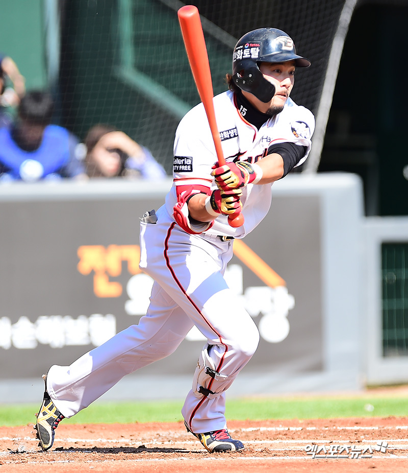 [엑스포츠뉴스 대전, 김한준 기자] 3일 오후 대전광역시 중구 한화생명이글스파크에서 열린 '2018 신한은행 MY CAR KBO리그' 롯데 자이언츠와 한화 이글스의 경기, 1회말 무사 1루 한화 이용규가 우전안타를 날리고 있다.