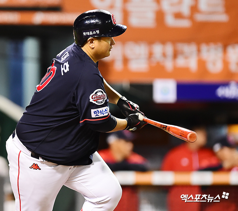 [엑스포츠뉴스 대전, 김한준 기자] 4일 오후 대전광역시 중구 한화생명이글스파크에서 열린 '2018 신한은행 MY CAR KBO리그' 롯데 자이언츠와 한화 이글스의 경기, 9회초 무사 1루 롯데 이대호가 좌전안타를 날리고 있다.