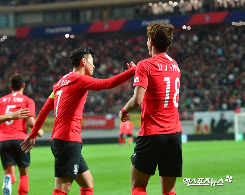 [엑스포츠뉴스 상암, 김한준 기자] 12일 오후 서울 성산동 서울월드컵경기장에서 열린 대한민국과 우루과이 평가전 경기, 대한민국 황의조가 선제골을 넣은 후 손흥민과 하이파이브를 하고 있다.