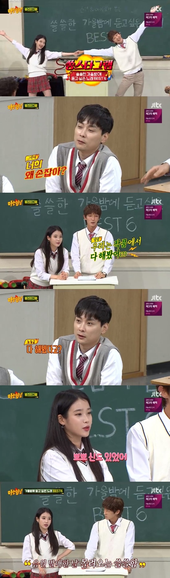 이어 아이유는 "'아는형님' 멤버들이 가을을 많이 탄다고 해서 쓸쓸함을 달래줄 노래를 준비했다"고 코너를 준비한 이유를 말했다.
