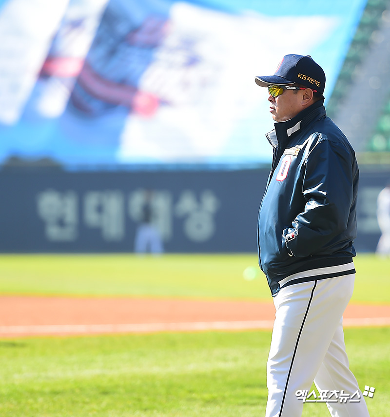 [엑스포츠뉴스 잠실, 김한준 기자] 4일 오후 서울 송파구 잠실야구장에서 열리는 '2018 신한은행 MY CAR KBO 포스트시즌' SK 와이번스와 두산 베어스의 한국시리즈 1차전 경기, 두산 김태형 감독이 선수들의 훈련을 지켜보고 있다.