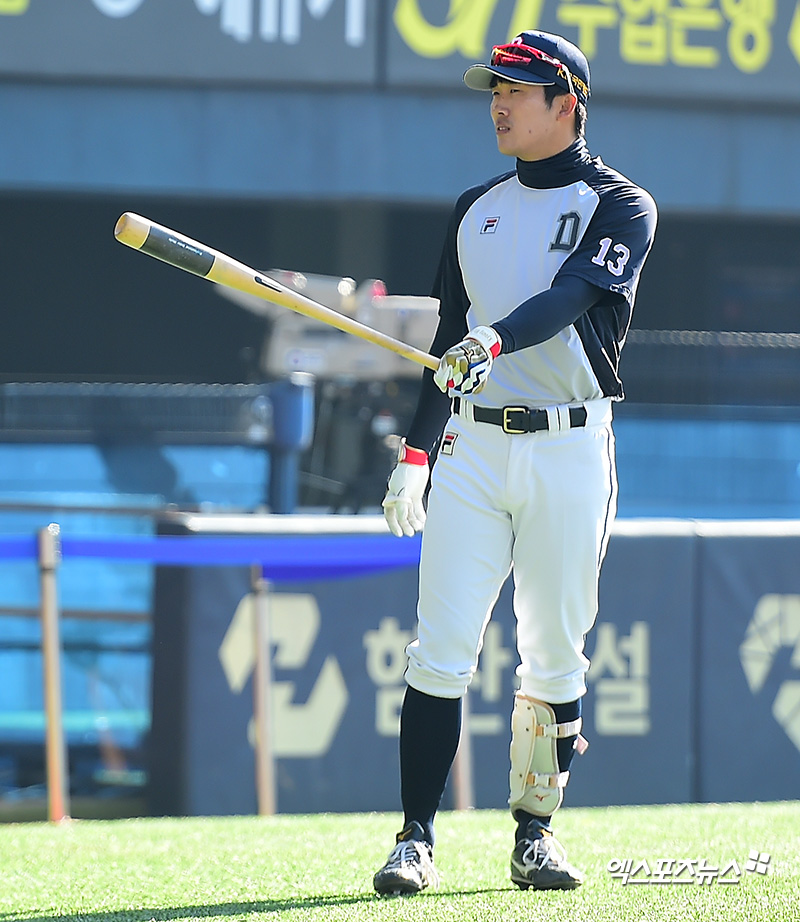 [엑스포츠뉴스 잠실, 김한준 기자] 4일 오후 서울 송파구 잠실야구장에서 열리는 '2018 신한은행 MY CAR KBO 포스트시즌' SK 와이번스와 두산 베어스의 한국시리즈 1차전 경기, 두산 허경민이 훈련에 임하고 있다.