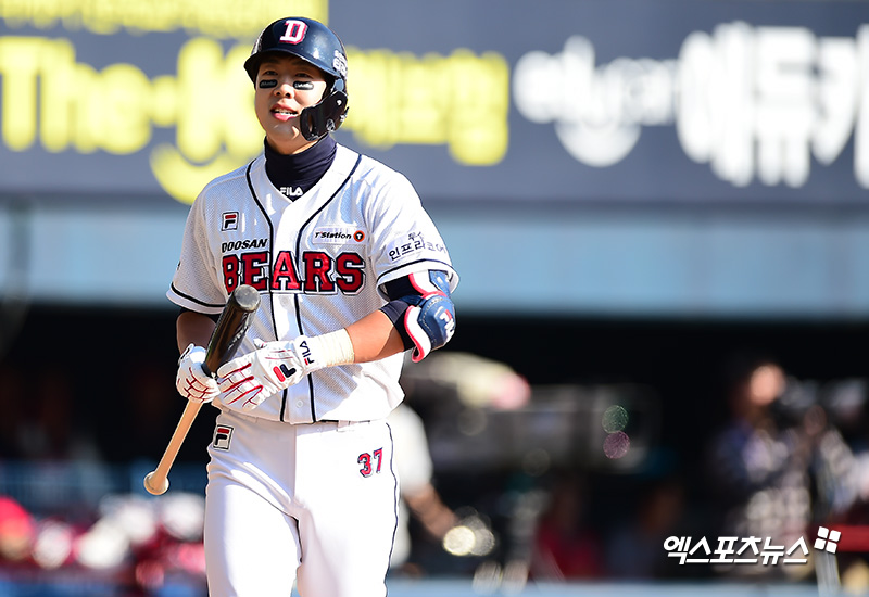[엑스포츠뉴스 잠실, 김한준 기자] 4일 오후 서울 송파구 잠실야구장에서 열린 '2018 신한은행 MY CAR KBO 포스트시즌' SK 와이번스와 두산 베어스의 한국시리즈 1차전 경기, 1회말 1사 1루 두산 박건우가 루킹 삼진을 당한 후 더그아웃으로 향하고 있다.