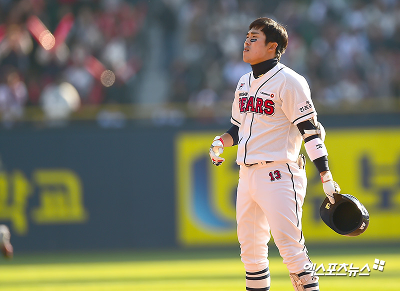 [엑스포츠뉴스 잠실, 김한준 기자] 4일 오후 서울 송파구 잠실야구장에서 열린 '2018 신한은행 MY CAR KBO 포스트시즌' SK 와이번스와 두산 베어스의 한국시리즈 1차전 경기, 2회말 2사 만루 두산 허경민이 우익수 플라이로 아웃된 후 아쉬워하고 있다.