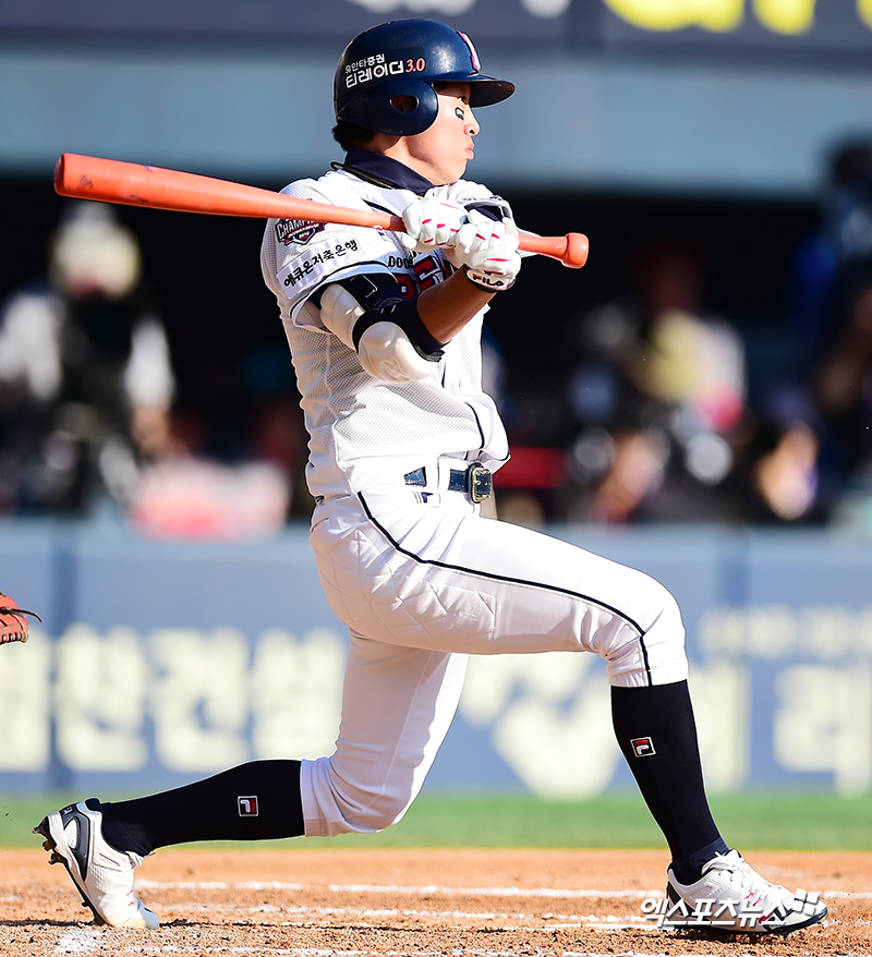 [엑스포츠뉴스 잠실, 김한준 기자] 4일 오후 서울 송파구 잠실야구장에서 열린 '2018 신한은행 MY CAR KBO 포스트시즌' SK 와이번스와 두산 베어스의 한국시리즈 1차전 경기, 3회말 두산 정수빈이 우중간 안타를 날리고 있다.