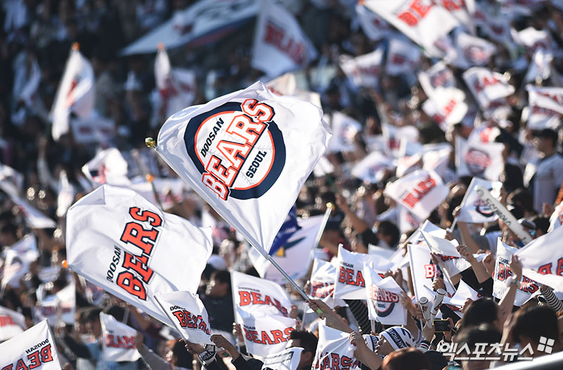 [엑스포츠뉴스 잠실, 박지영 기자] 4일 오후 서울 송파구 잠실야구장에서 열린 '2018 신한은행 MY CAR KBO 포스트시즌' SK 와이번스와 두산 베어스의 한국시리즈 1차전 경기, 두산 팬들이 열띤 응원을 펼치고 있다.