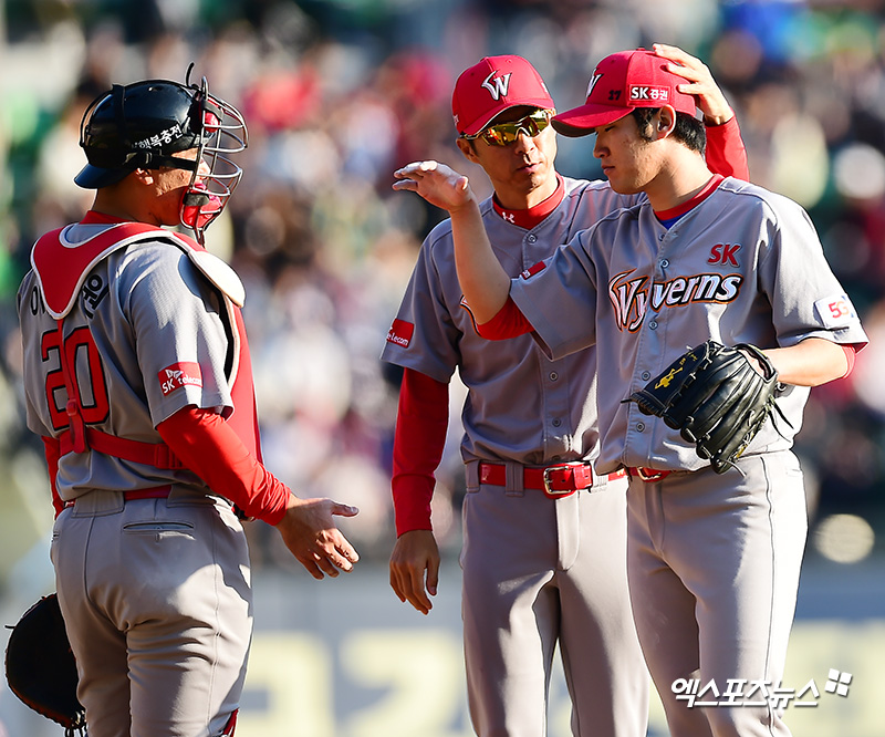 [엑스포츠뉴스 잠실, 김한준 기자] 4일 오후 서울 송파구 잠실야구장에서 열린 '2018 신한은행 MY CAR KBO 포스트시즌' SK 와이번스와 두산 베어스의 한국시리즈 1차전 경기, 5회말 1사 2루 SK 선발투수 박종훈이 마운드를 내려가고 있다.