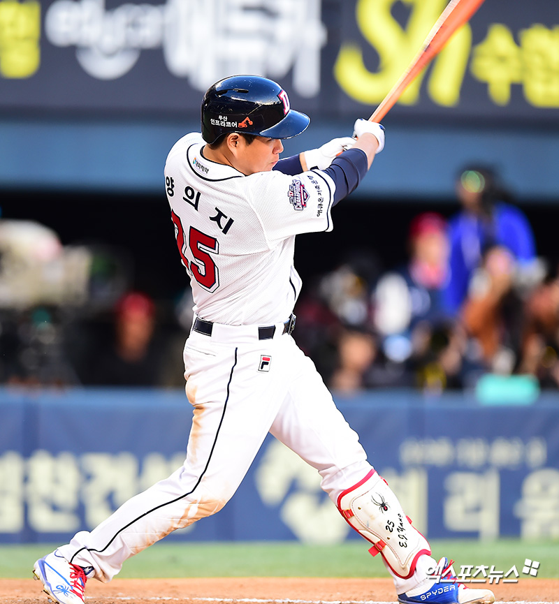 [엑스포츠뉴스 잠실, 김한준 기자] 4일 오후 서울 송파구 잠실야구장에서 열린 '2018 신한은행 MY CAR KBO 포스트시즌' SK 와이번스와 두산 베어스의 한국시리즈 1차전 경기, 7회말 무사 1루 두산 양의지가 좌전안타를 날리고 있다.