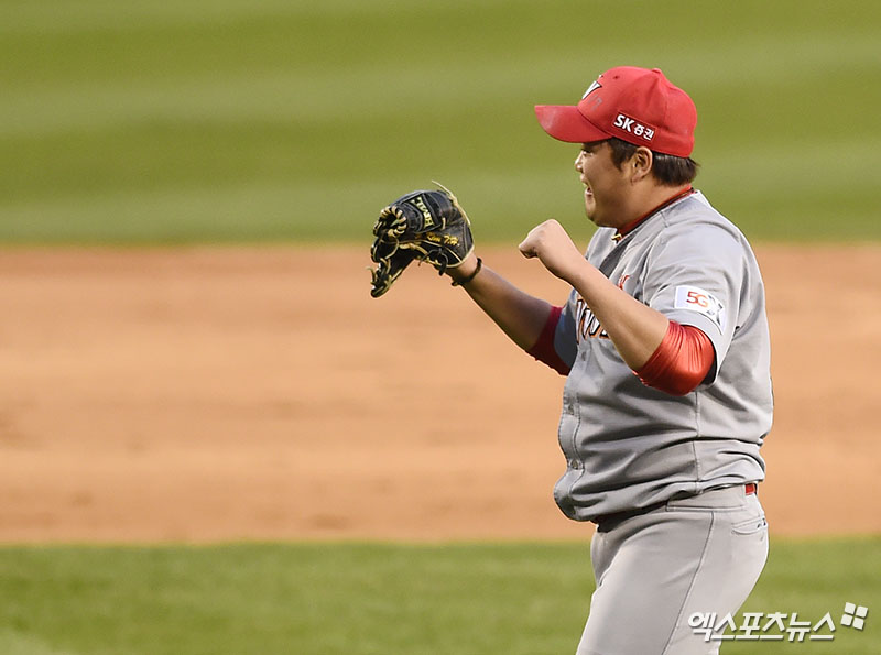 [엑스포츠뉴스 잠실, 박지영 기자] 4일 오후 서울 송파구 잠실야구장에서 열린 '2018 신한은행 MY CAR KBO 포스트시즌' SK 와이번스와 두산 베어스의 한국시리즈 1차전 경기, 7회말 1사 만루 SK 김태훈이 두산 타자 김재호와 1루주자 최주환을 병살 처리하며 이닝 종료시킨 뒤 환호하고 있다.