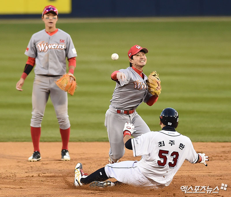 [엑스포츠뉴스 잠실, 박지영 기자] 4일 오후 서울 송파구 잠실야구장에서 열린 '2018 신한은행 MY CAR KBO 포스트시즌' SK 와이번스와 두산 베어스의 한국시리즈 1차전 경기, 7회말 1사 만루 두산 김재호의 타구를 SK 김성현이 1루로 송구하며 병살 처리하고 있다.