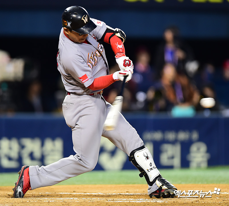 [엑스포츠뉴스 잠실, 김한준 기자] 4일 오후 서울 송파구 잠실야구장에서 열린 '2018 신한은행 MY CAR KBO 포스트시즌' SK 와이번스와 두산 베어스의 한국시리즈 1차전 경기, 9회초 무사 1루 SK 김강민이 좌전안타를 날리고 있다.