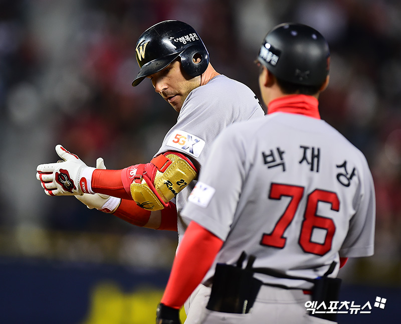 [엑스포츠뉴스 잠실, 김한준 기자] 4일 오후 서울 송파구 잠실야구장에서 열린 '2018 신한은행 MY CAR KBO 포스트시즌' SK 와이번스와 두산 베어스의 한국시리즈 1차전 경기, 9회초 1사 1,3루 SK 로맥이 두산 오재일의 송구 실책으로 출루에 성공한 후 박수를 치고 있다.
