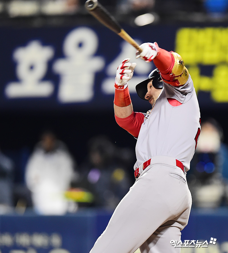 [엑스포츠뉴스 잠실, 김한준 기자] 5일 오후 서울 송파구 잠실야구장에서 열린 '2018 신한은행 MY CAR KBO 포스트시즌' SK 와이번스와 두산 베어스의 한국시리즈 2차전 경기, 1회초 2사 1루 SK 로맥이 좌전안타를 날리고 있다.