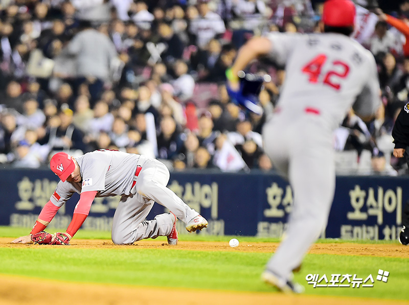 [엑스포츠뉴스 잠실, 김한준 기자] 5일 오후 서울 송파구 잠실야구장에서 열린 '2018 신한은행 MY CAR KBO 포스트시즌' SK 와이번스와 두산 베어스의 한국시리즈 2차전 경기, 1회말 1사 SK 로맥이 두산 정수빈의 타구를 몸으로 막아내고 있다.