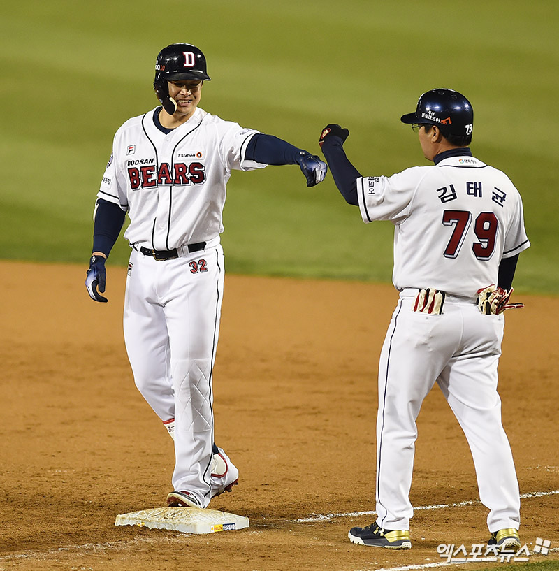 [엑스포츠뉴스 잠실, 박지영 기자] 5일 오후 서울 송파구 잠실야구장에서 열린 '2018 신한은행 MY CAR KBO 포스트시즌' SK 와이번스와 두산 베어스의 한국시리즈 2차전 경기, 8회말 무사 1루 두산 김재환이 안타를 때려낸 뒤 미소짓고 있다.