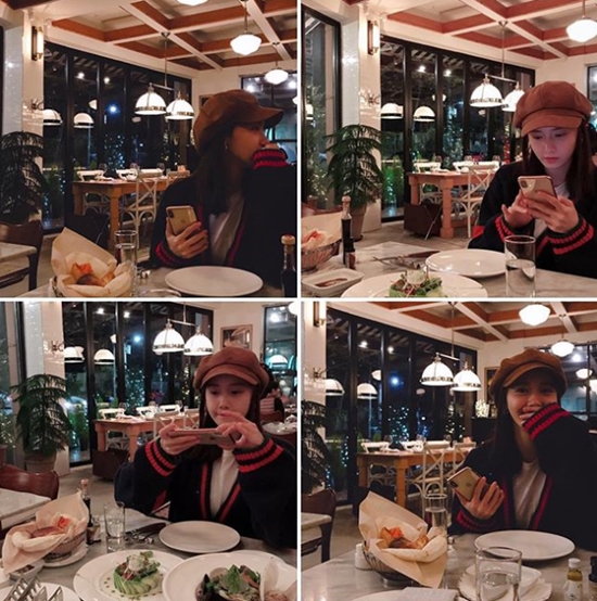 게재된 사진 속 윤아는 식사에 앞서 나온 음식을 사진찍고 있다. 윤아는 카메라와 눈이 마주치자 부끄러운 듯한 미소를 지어 귀여운 매력을 자아냈다.