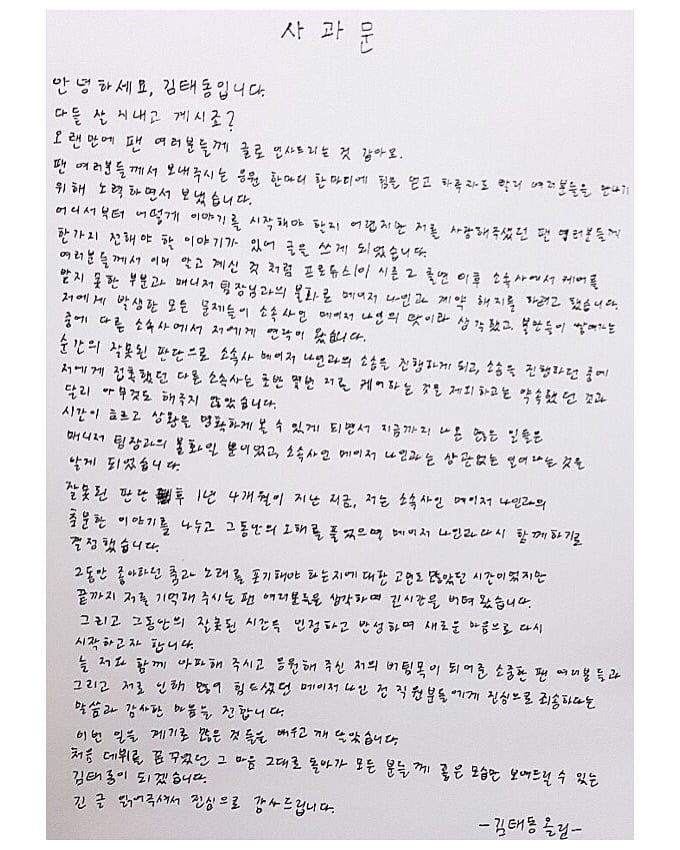 [전문] '프듀2' 김태동 "소속사와 소송은 잘못된 판단…반성한다" 자필편지 공개